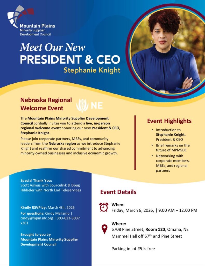 📍 Nebraska Regional Welcome Event Meet Our New President & CEO, Stephanie Knight The Mountain Plains Minority Supplier Development Council invites Nebraska MBEs, corporate members, and regional partners to a live, in-person welcome event honoring our new President & CEO, Stephanie Knight. Join us for an opportunity to connect with MPMSDC leadership, hear brief remarks (more…)